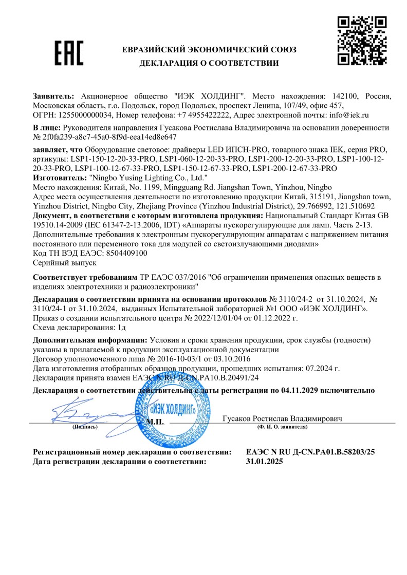 ЕАЭС N RU Д-CN.PA01.B.58203/25 (ТР ЕАЭС 037/2016) до 04.11.2029