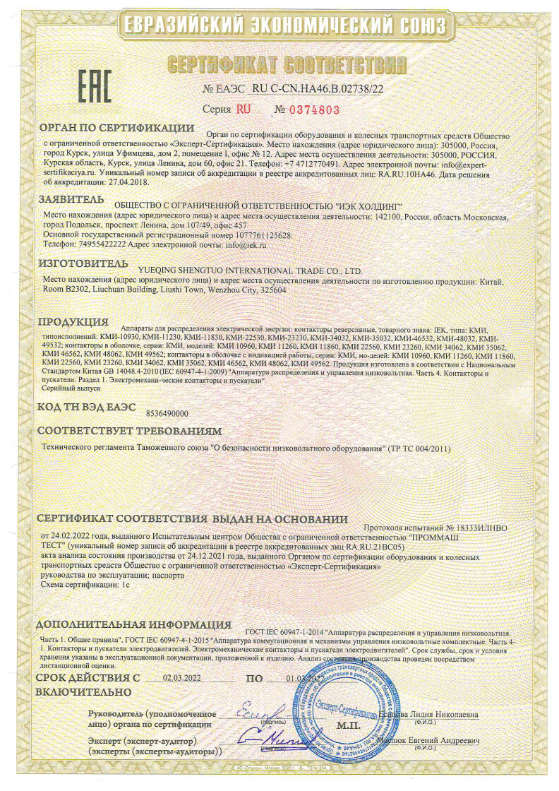 СТС №ТС RU С-СN.НА46.В.02738/22 ИЭК до 01.03.2027