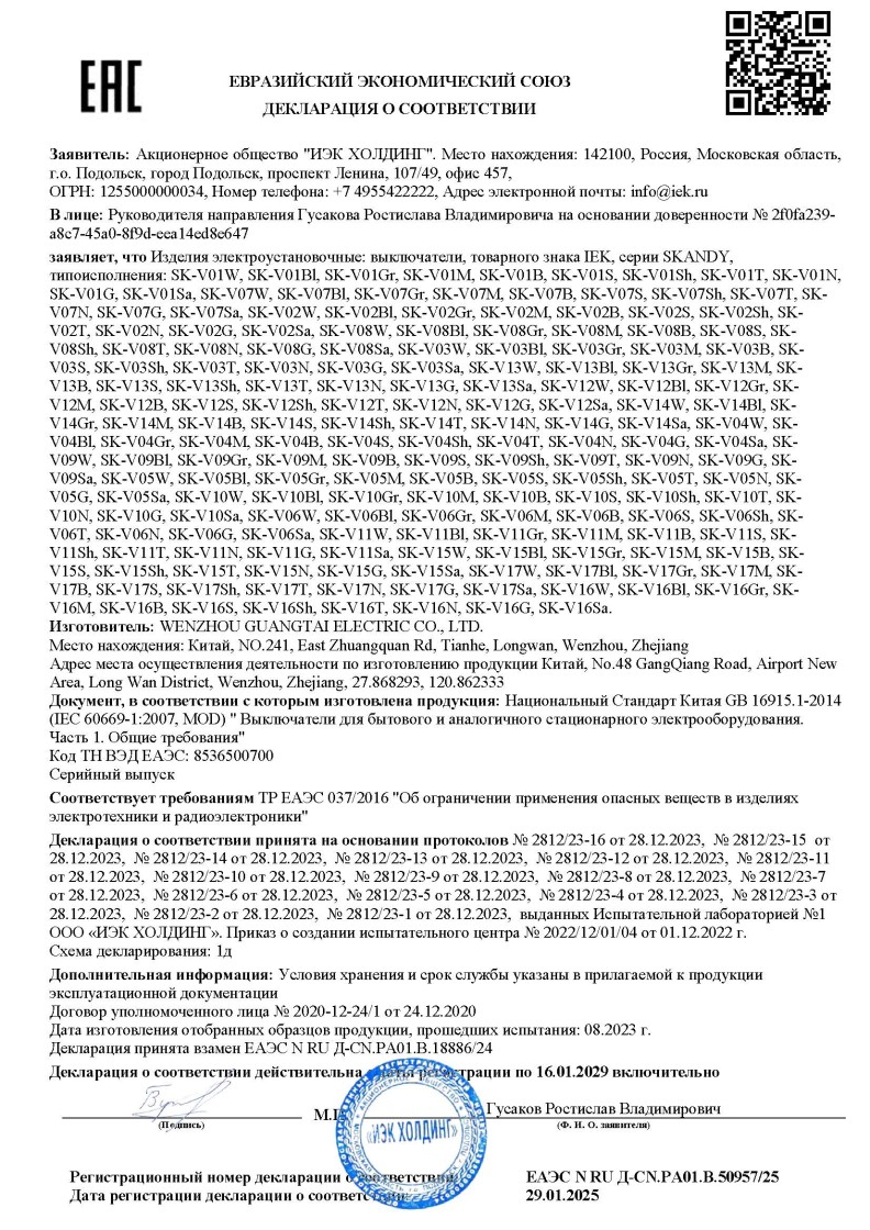 ЕАЭС N RU Д-CN.PA01.B.50957/25 ( ТР ЕАЭС 037/2016) до 16.01.2029