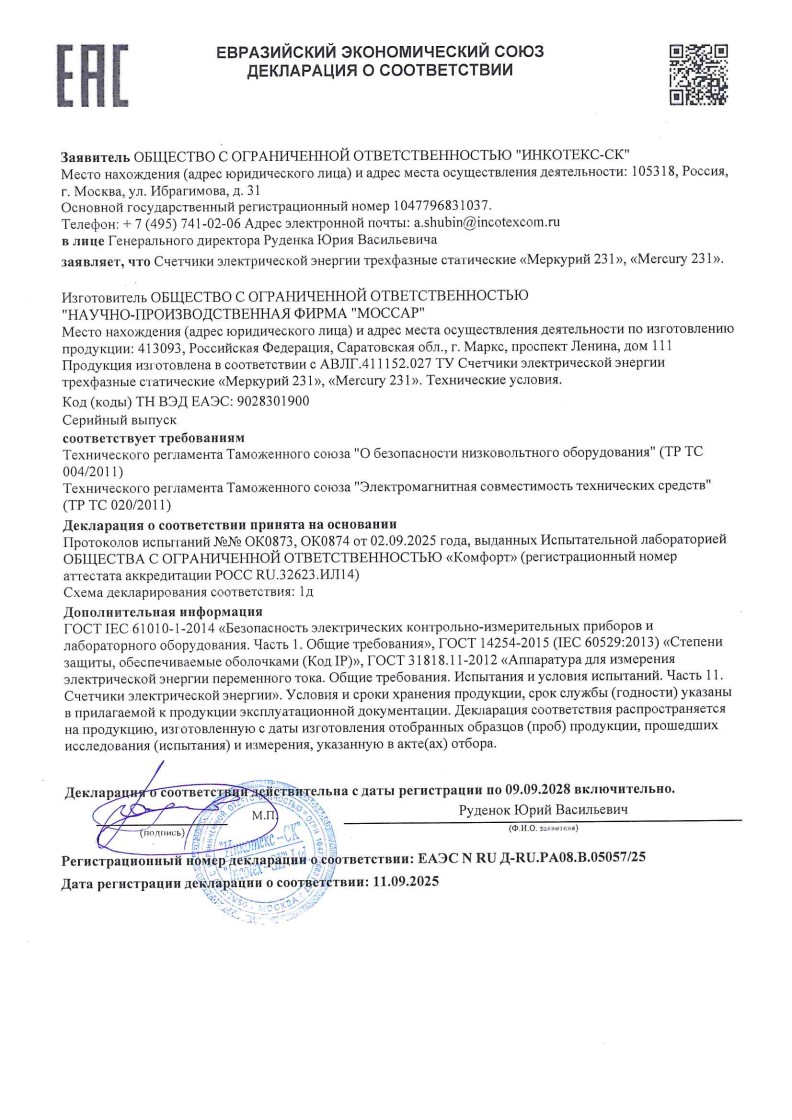 ЕЭС ДС №ЕАЭС N RU Д-RU.PA08.В.05057/25 Меркурий231 до 09.09.2028