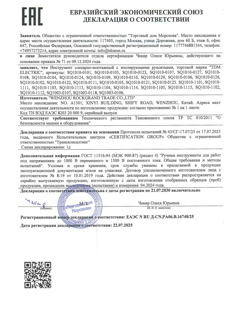 ЕАЭС N RU Д-СN.РА06.В.16748/23 (ТР ТС 010/2011) до 21.07.2030