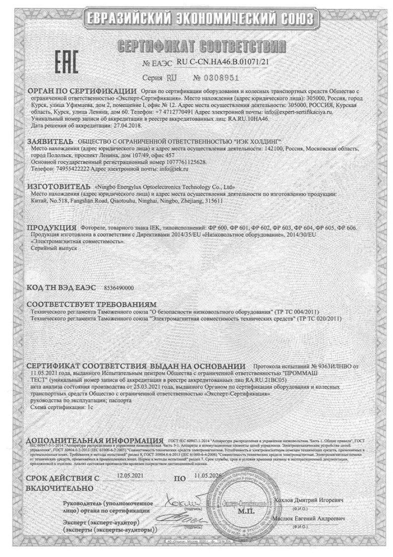 ЕАЭС №RU C-CN.НА46.B.01071/21 (ТР ТС 004/2011, ТР ТС 020/2011 ) до 11.05.2026