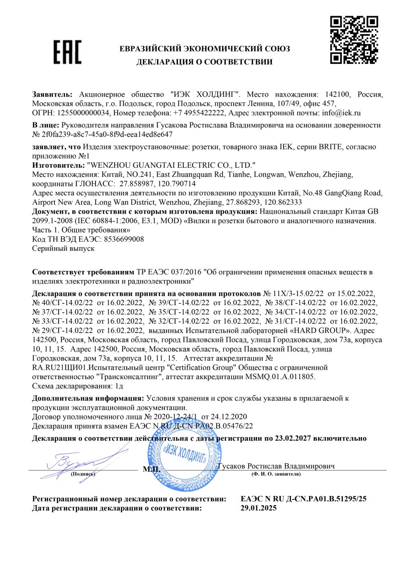ЕАЭС №RU Д-RU.РА01.В.51295/25 (ТР ЕАЭС 037/2016) до 23.02.2027