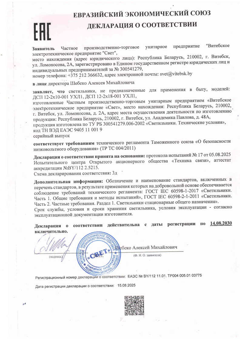 ЕАЭС №ЕАЭС № BY/112 11.01. TP004 005.01 03775 СВЕТ до 14.08.2030