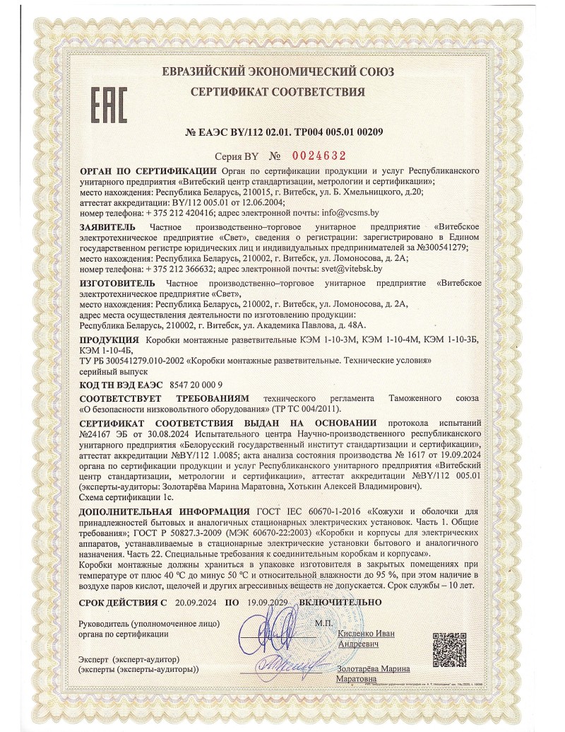 ЕАЭС №ЕАЭС BY 02.01. ТР004 005.01 00209 СВЕТ до 19.09.2029