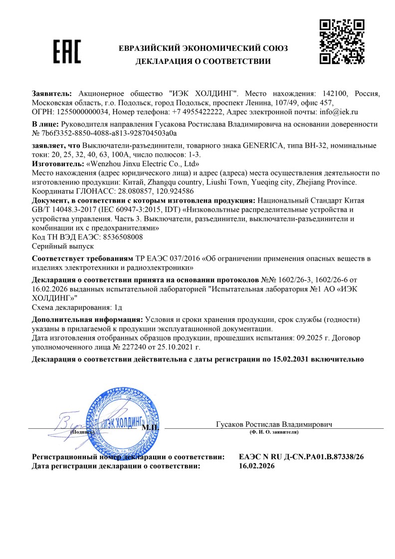 ЕАЭС №RU Д-CN.РА01.В.87338/26 (ТР ЕАЭС 037/2016) до 15.02.2031