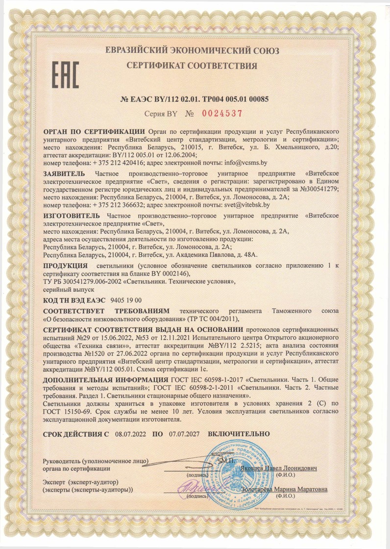 ЕАЭС №ЕАЭС BY 02.01. ТР004 005.01 00085 СВЕТ до 07.07.2027