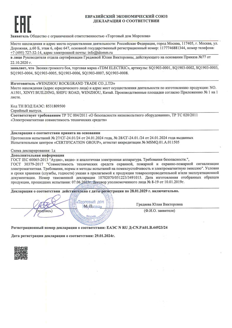 ЕЭСДС 037 №ЕАЭС RU Д-CN.РА01.В.44923/24_Звонок громкого боя МЗМ-1С-150м до 29.01.2029