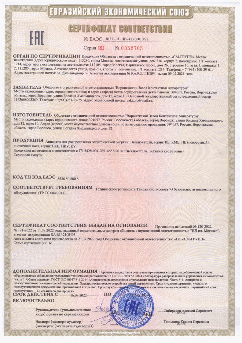 ЕАЭС №EAЭС RU C-RU.НВ94.В.00010/22 до 15.08.2027