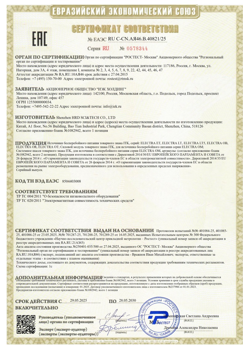 № ЕАЭС RU C-CN.АЯ46.В.40821/25 (ТР ТС 004/2011, ТР ТС 020/2011) до 28.05.2030