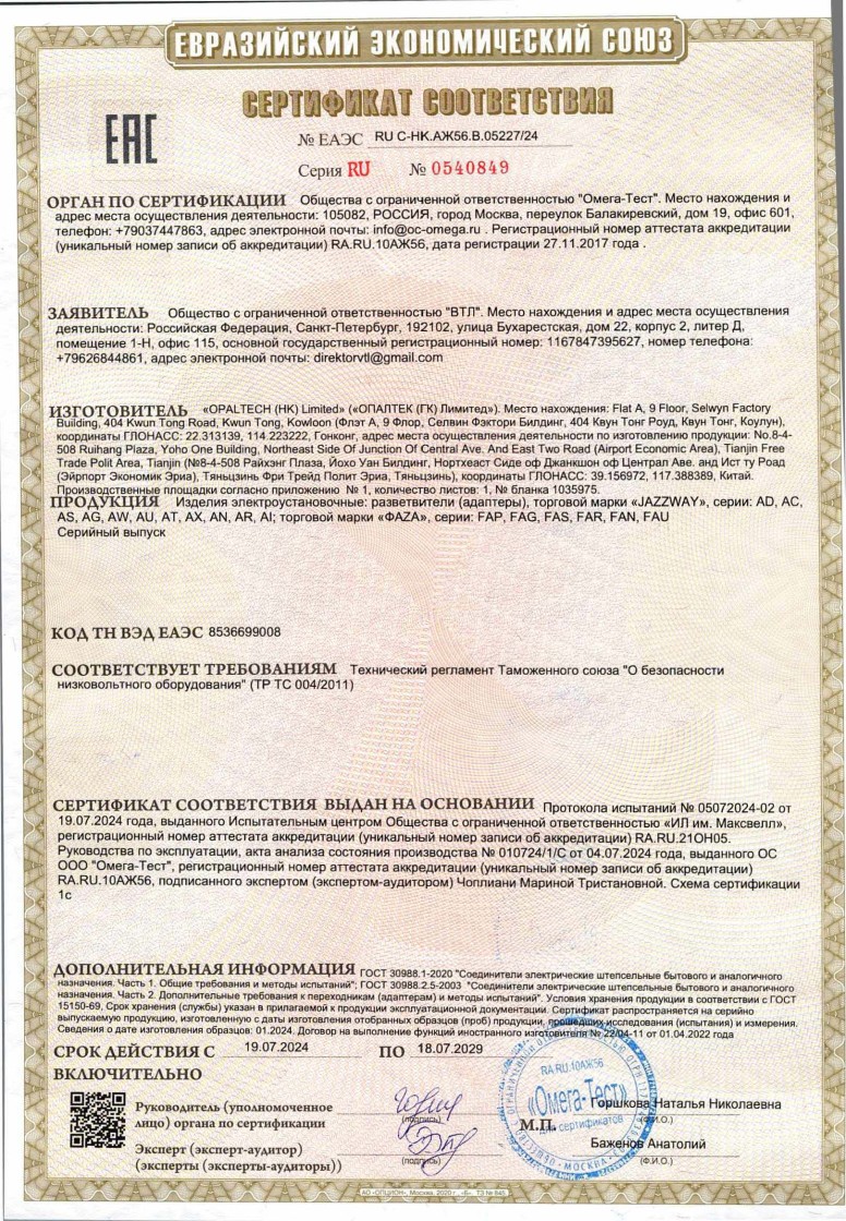 ЕАЭС №ЕАЭС RU C-HK.АЖ56.В.05227/24 до 18.07.2029