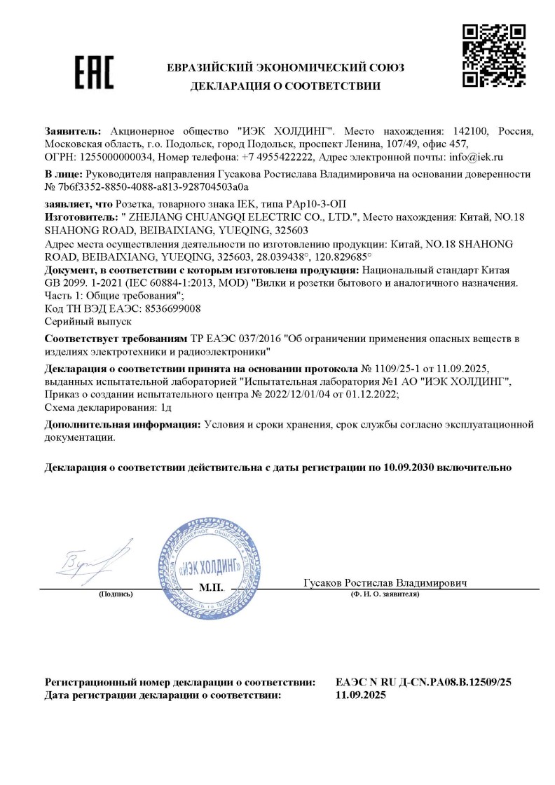 ЕАЭС N RU Д-CN.PA08.B.12509/25 (ТР ЕАЭС 037/2016) до 10.09.2030