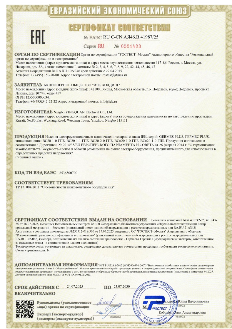 № ЕАЭС RU C-CN.АЯ46.В.41987/25 (ТР ТС 004/2011) до 21.05.2029