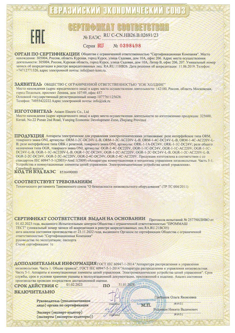 ЕАЭС №RU C-CN.НВ26.В.02691/23 ( (ТР ТС 004/2011) до 31.01.2028