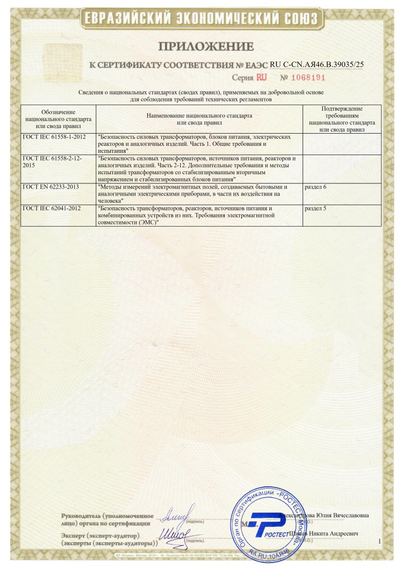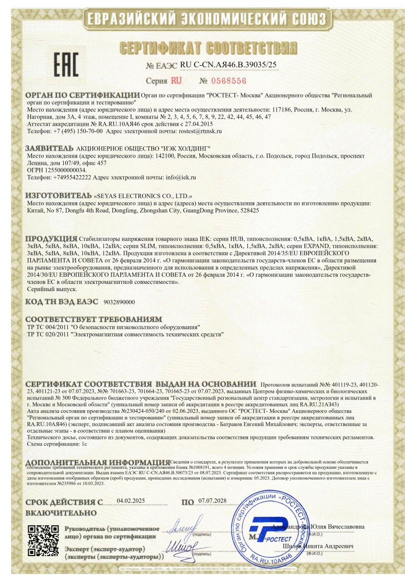 ЕАЭС №RU -CN.АЯ46.В.39035/25 (ТР ТС 004/2011, ТР ТС 020) до 07.07.2028