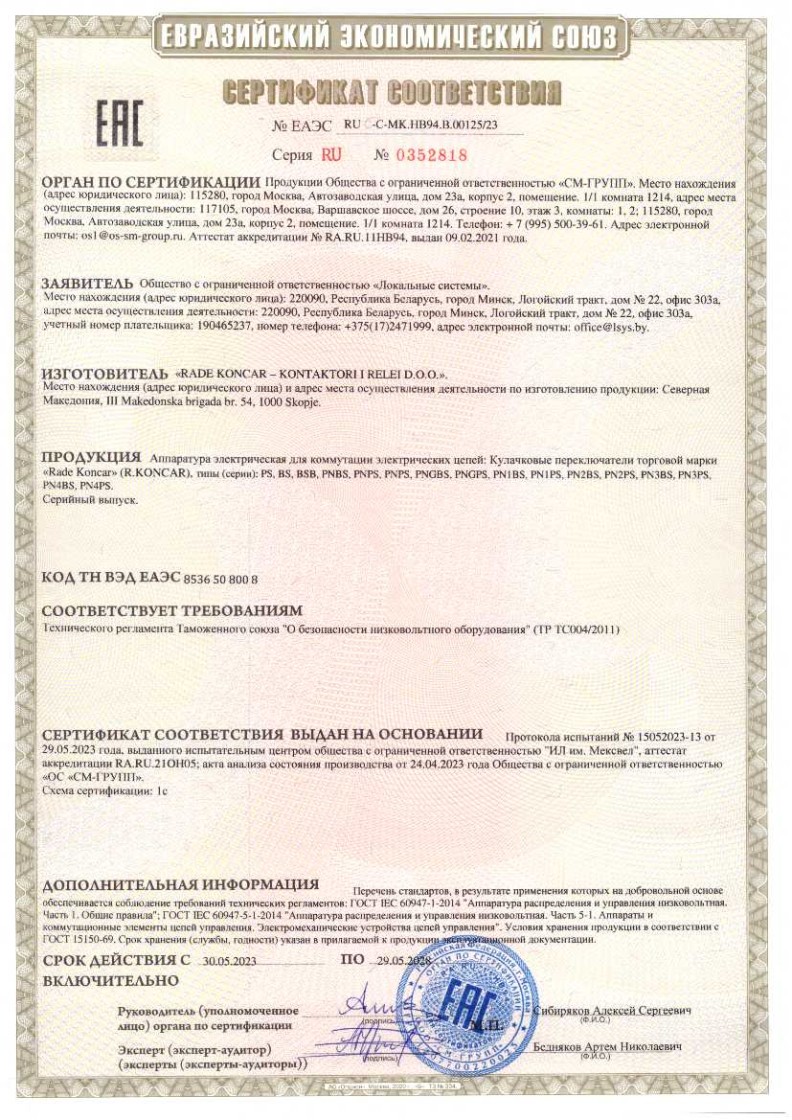 ЕАЭС №ЕАЭС RU С-MK.НВ94.В.00125/23 до 29.05.2028