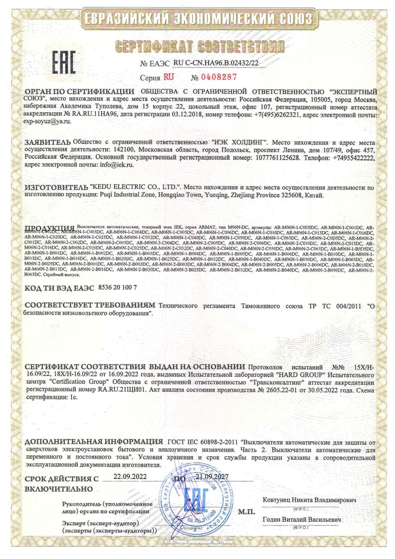 ЕАЭС №ЕАЭСRU C-CN.НА96.В.02432/22 ИЭК АО до 21.09.2027