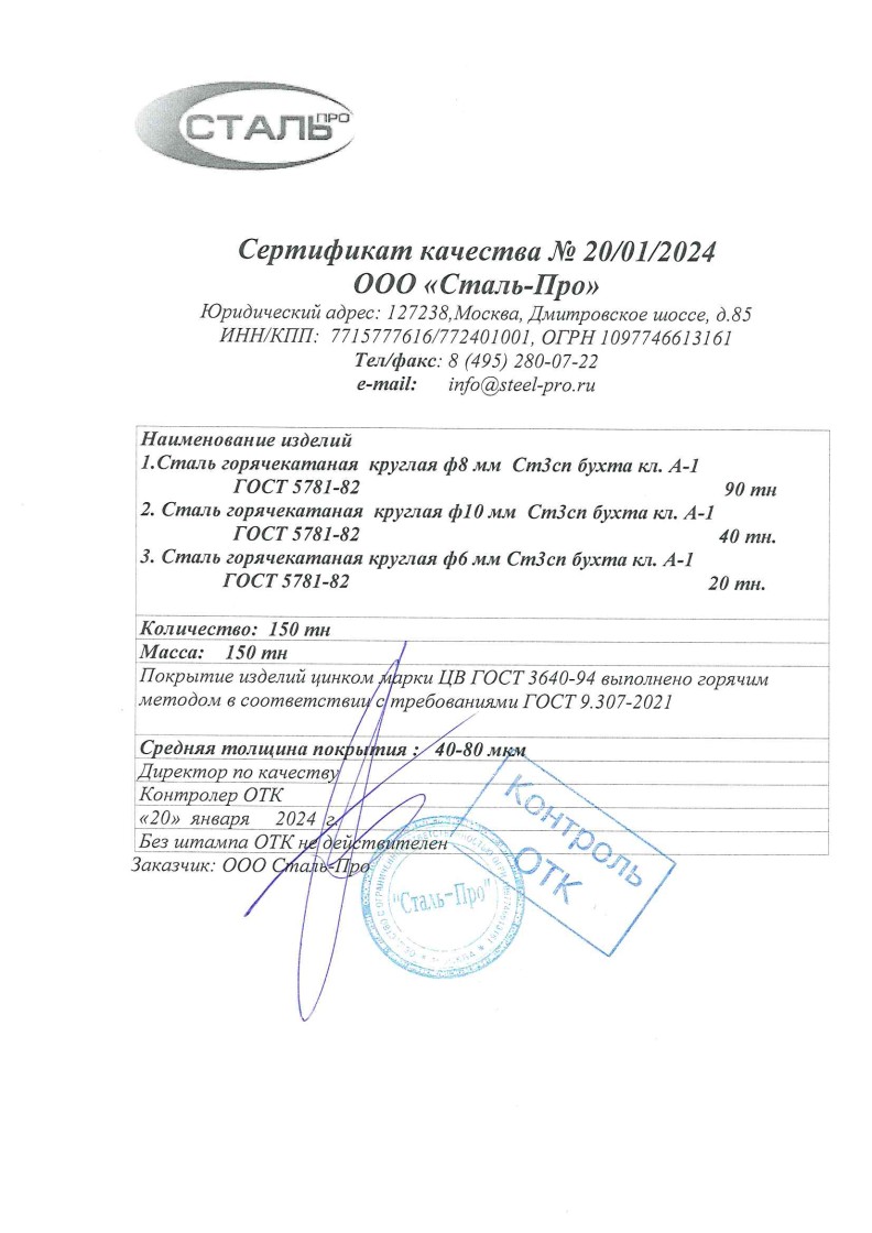 ПК №Паспорт Сертификат качества № 20/01/2024