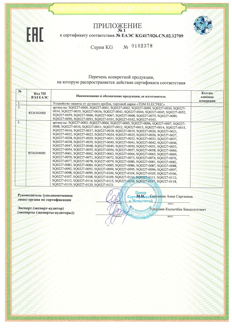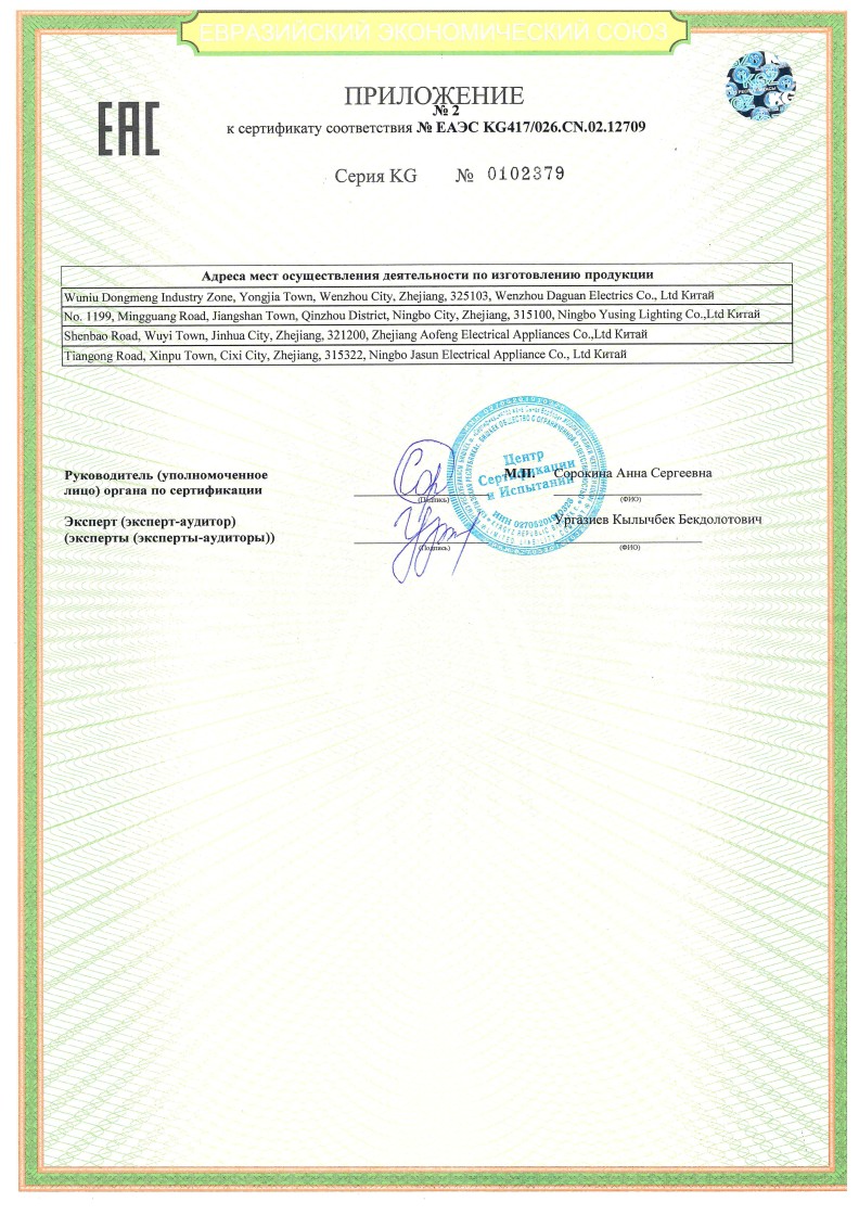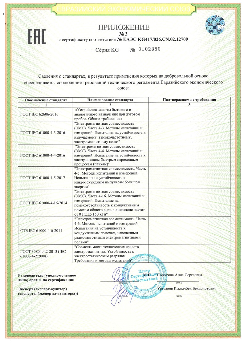 № ЕАЭС KG417/026.CN.02.12709 (ТР ТС 004/2011, ТР ТС 020/2011) до 11.03.2029
