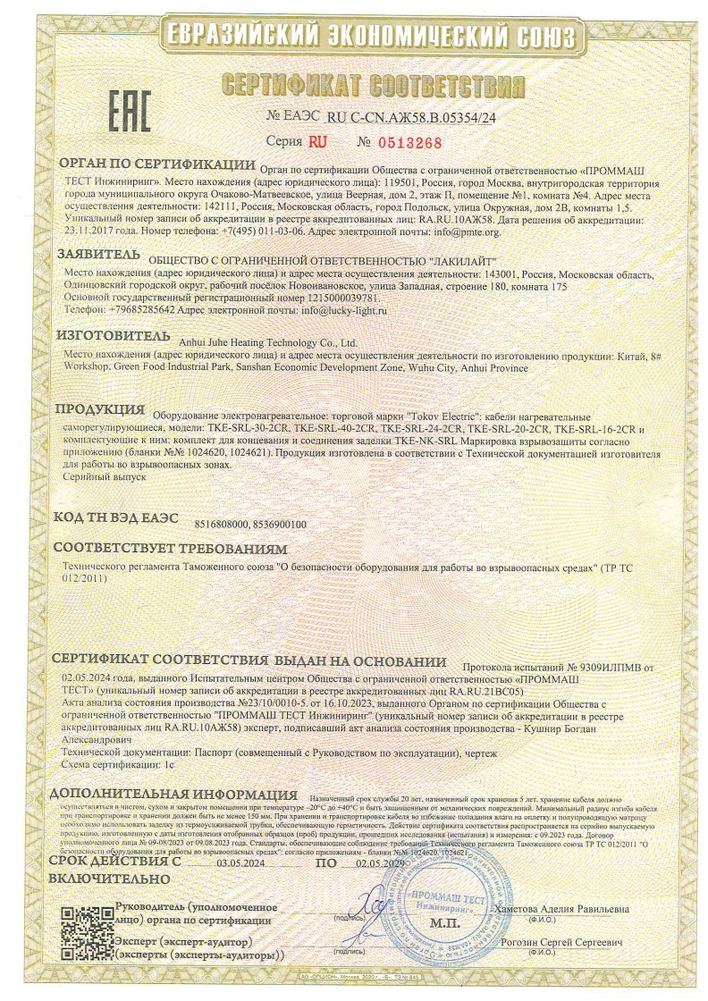 ЕАЭС №RU C-СN.АЖ58.В.05354/24 до 02.05.2029