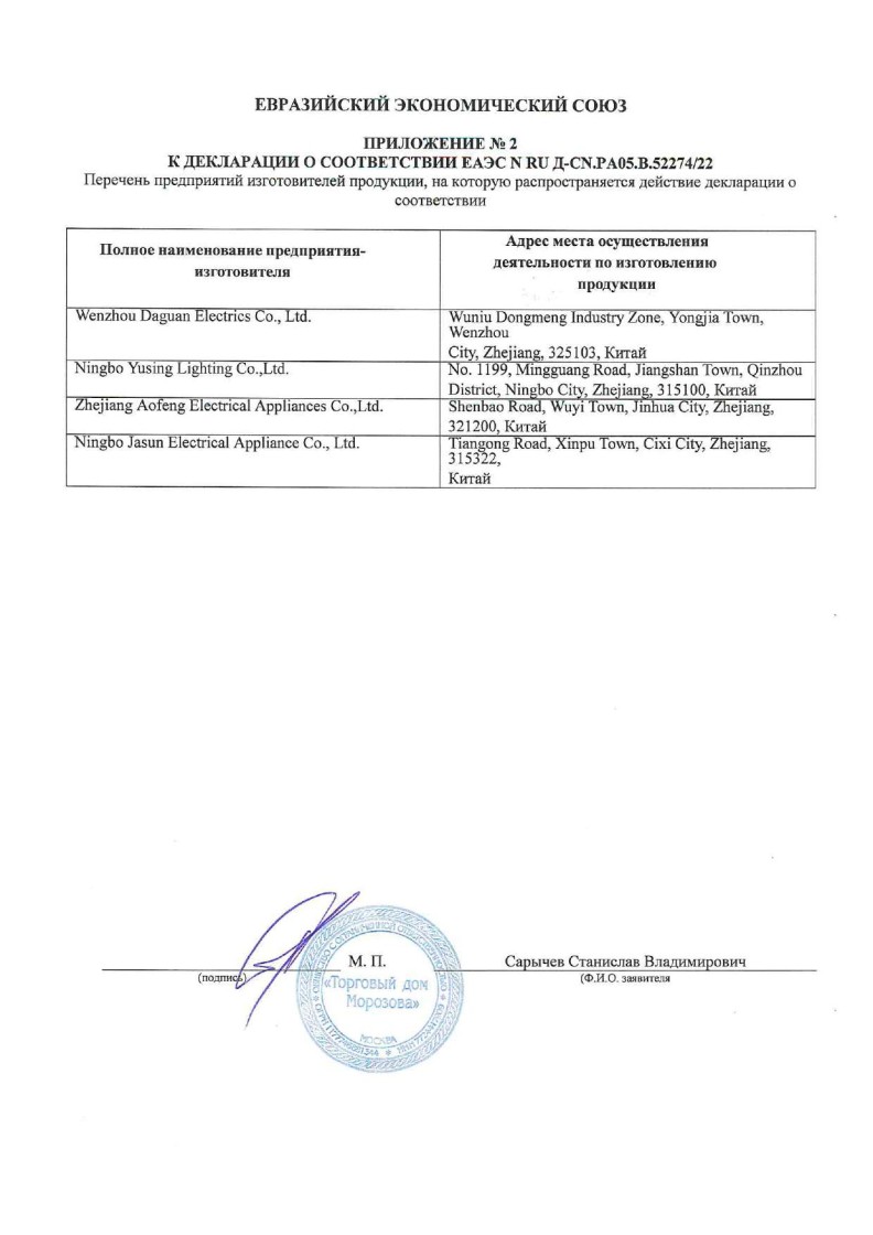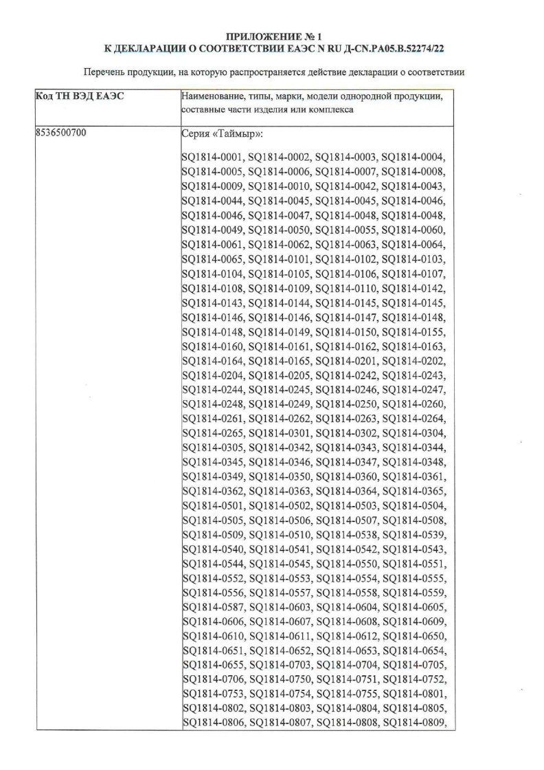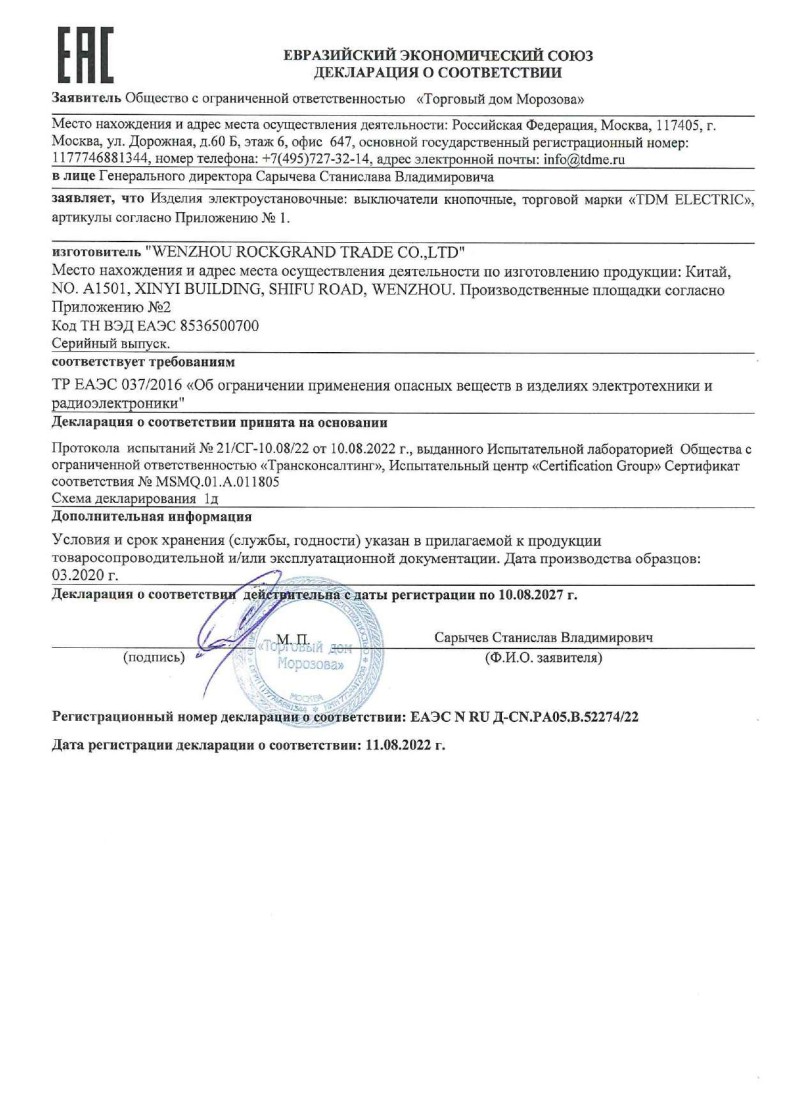 ЕАЭС №RU Д-CN.РА05.В.52274/22 (ТР ЕАЭС 037/2016) до 10.08.2027