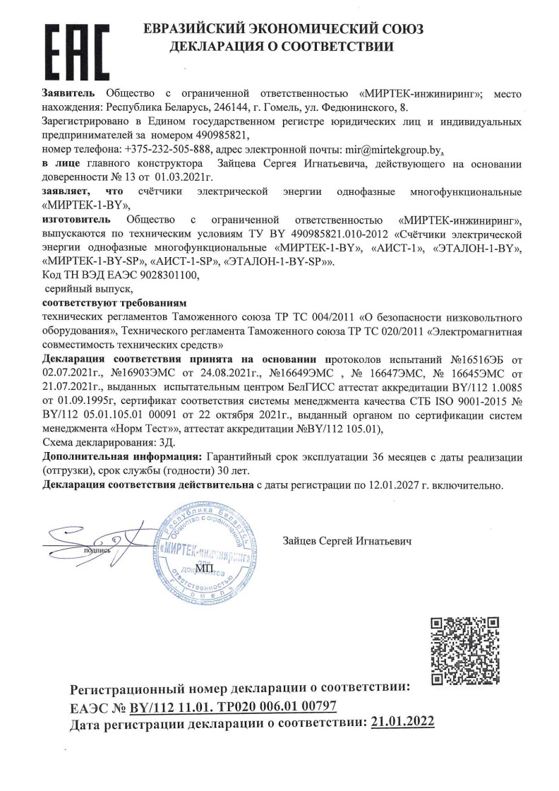 ЕЭС ДС №ЕАЭС № BY|112 11 01. TP020 006 00797 МИРТЕК до 12.01.2027
