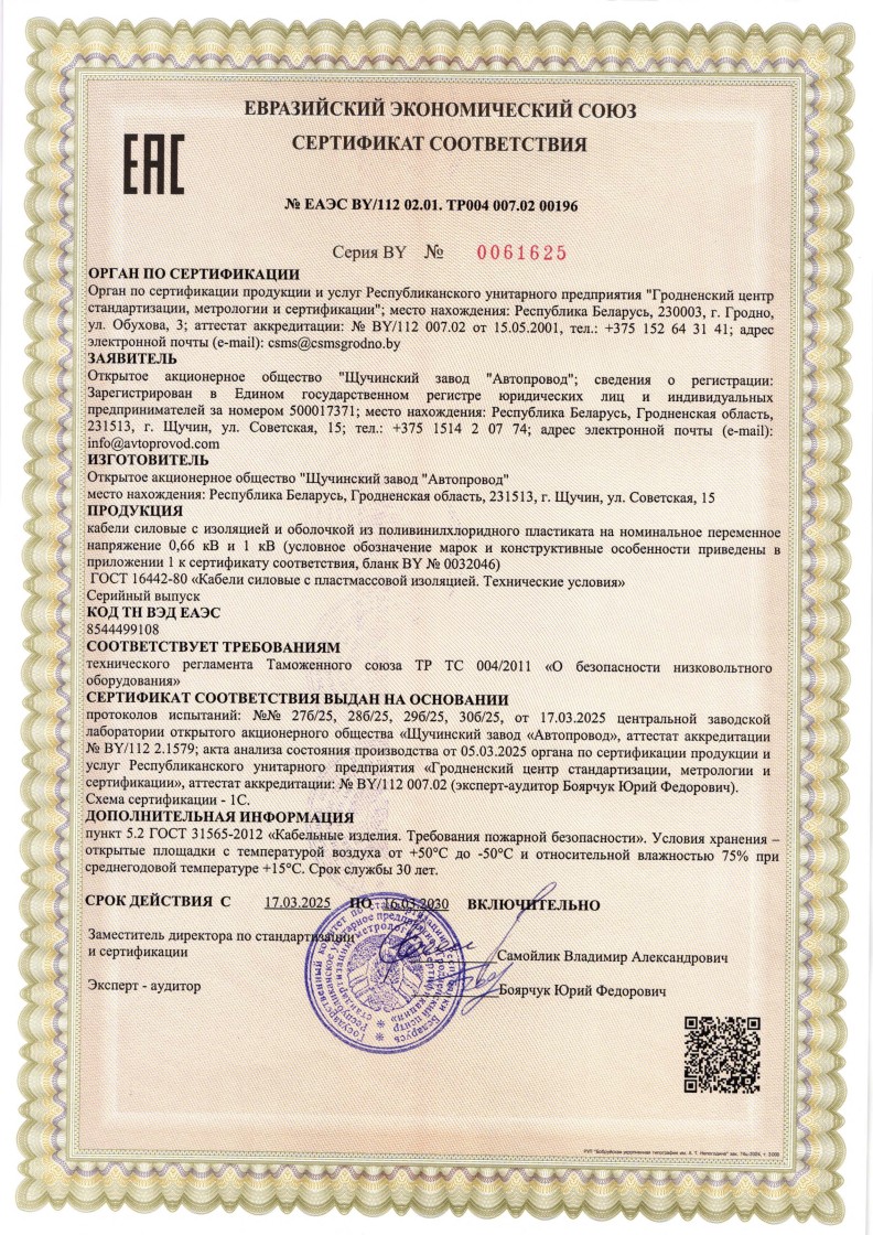ЕАЭС №ТС BY/112 02.01. ТР004 007.02 00196 (Щ) до 16.03.2030