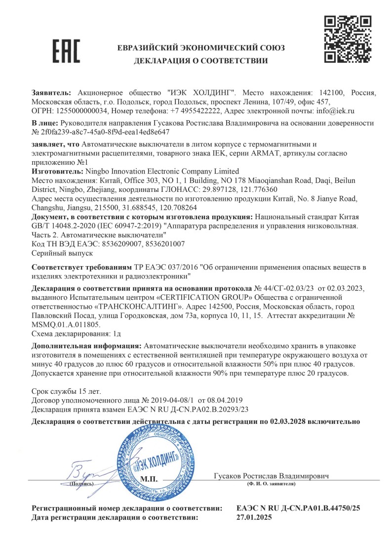 ЕАЭС N RU Д-CN.PA01.B.44750/25 (ТР ЕАЭС 037/2016) до 02.03.2028