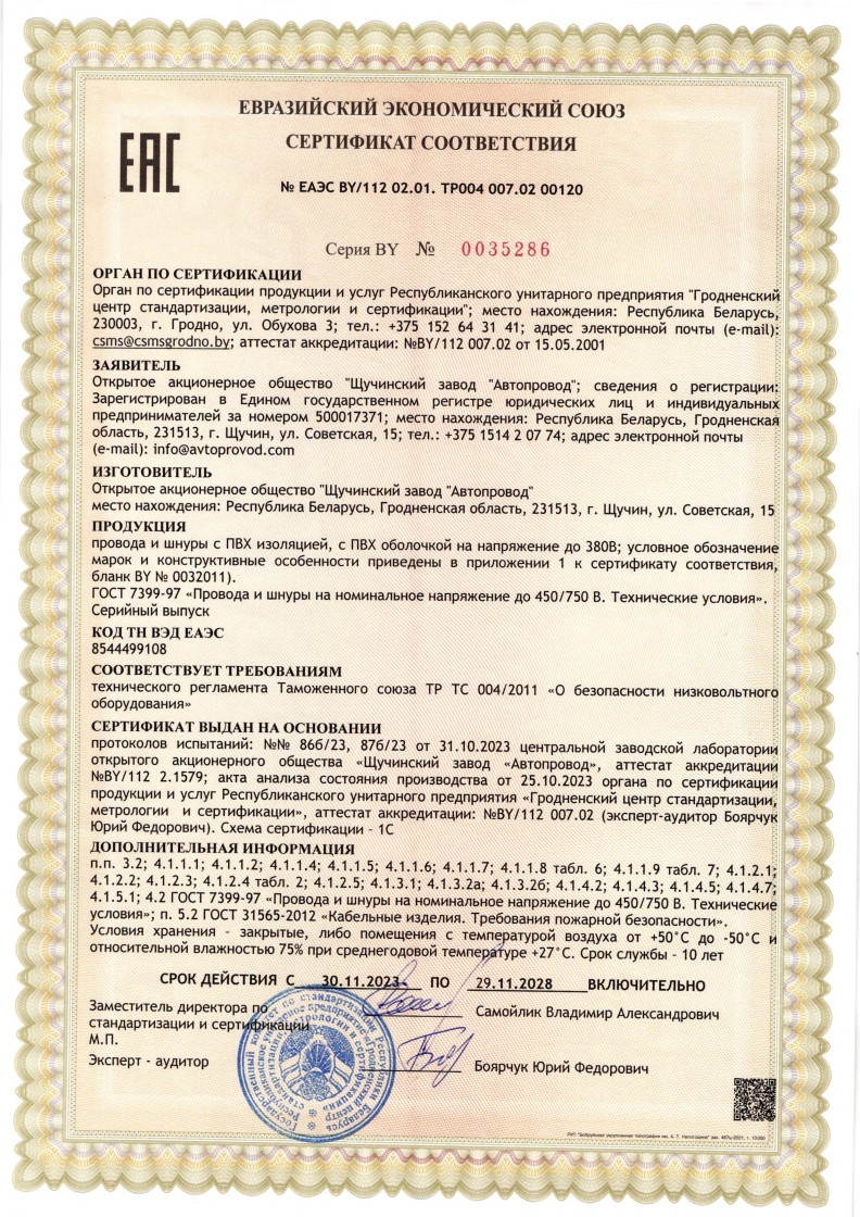ЕАЭС №ЕАЭС BY/112 02.01. TP004 007.02 00120 Щ до 29.11.2028