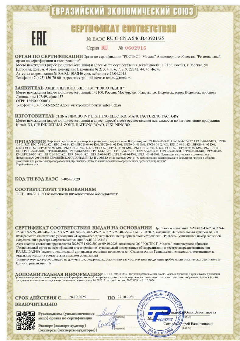 № ЕАЭС RU C-CN.AЯ46.B.43921/25 (ТР ТС 004/2011) до 27.10.2030