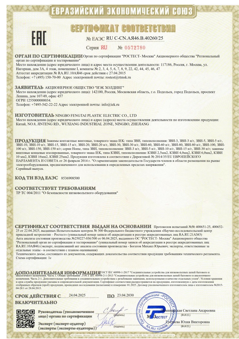 № ЕАЭС RU С-CN.АЯ46.В.40260/25 (ТР ТС 004/2011) до 23.04.2030
