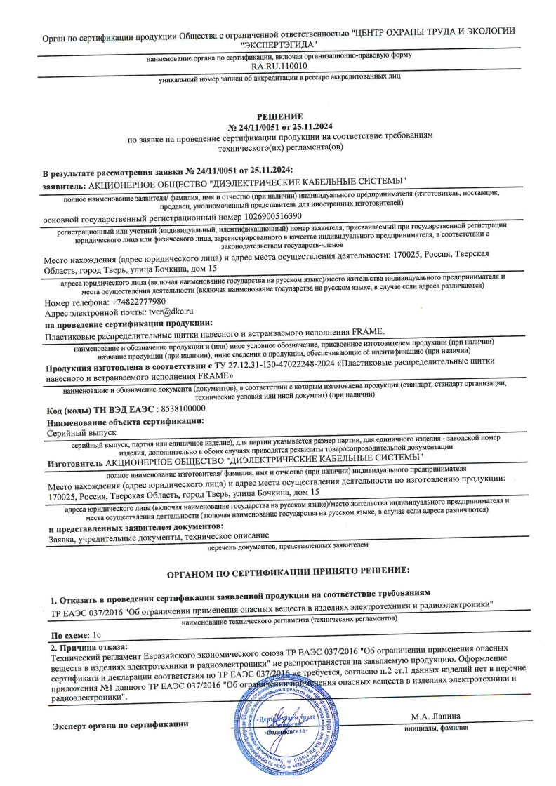 РЕШЕНИЕ №24/11/0009 Отказное письмо (ТР ТС 037)
