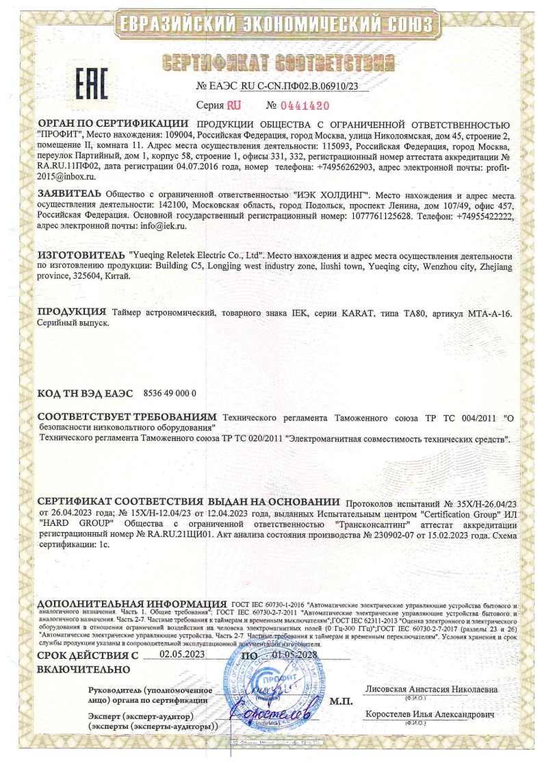 № ЕАЭС RU C-CN.ПФ02.В.06910/23 (ТР ТС 004/2011, ТР ТС 020/2011) до 01.05.2028