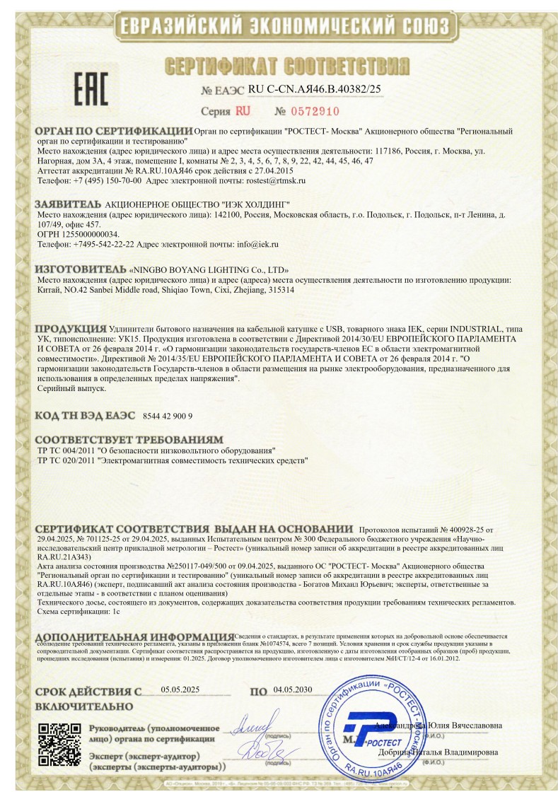 № ЕАЭС RU C-CN.АЯ46.В.40382/25 (ТР ТС 004/2011, ТР ТС 020/2011) до 04.05.2030