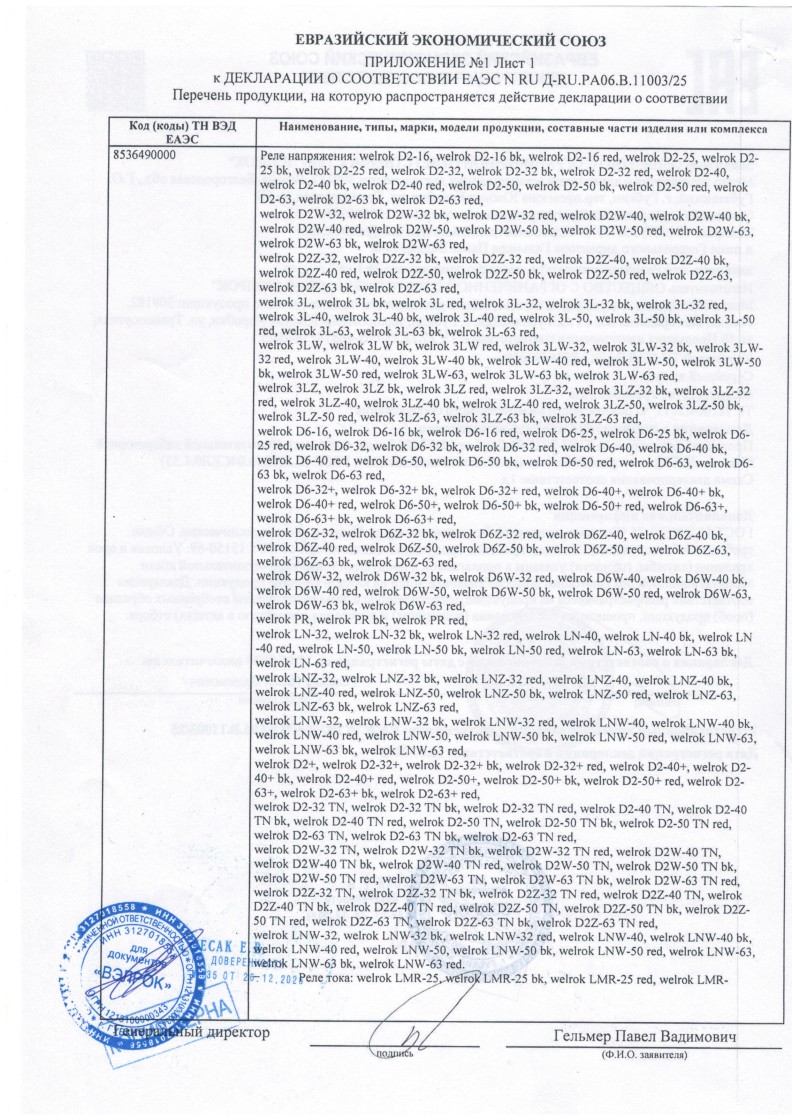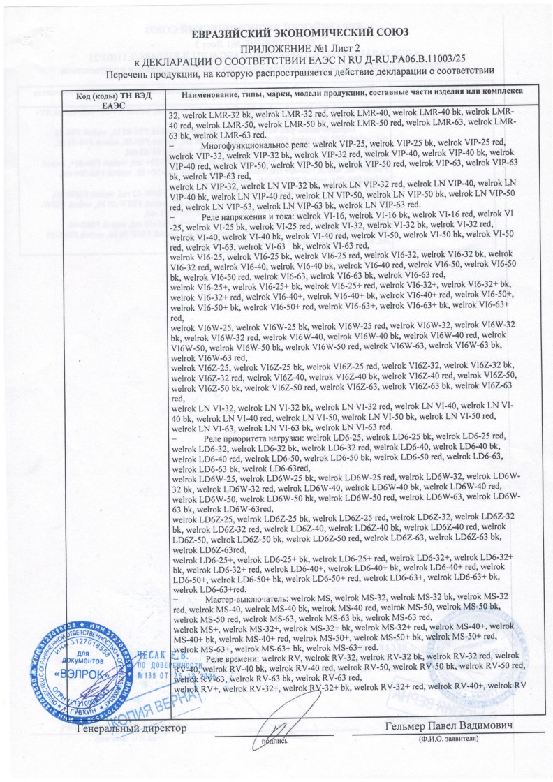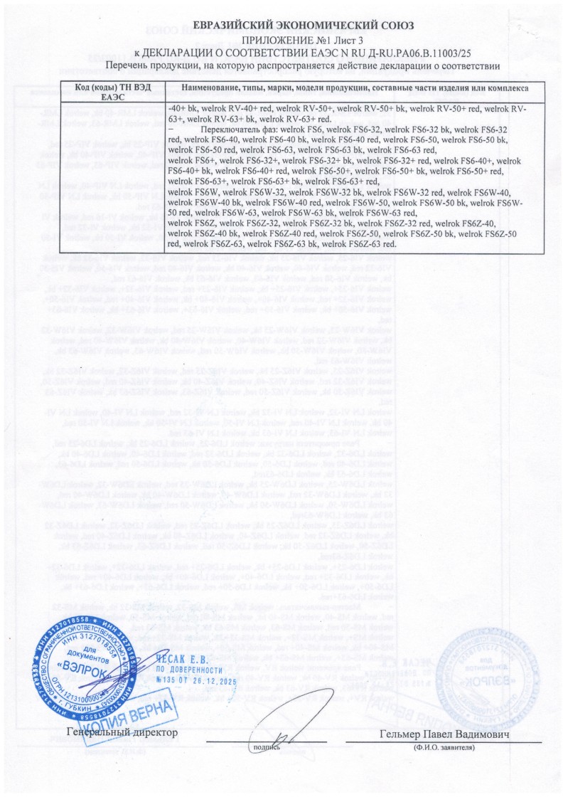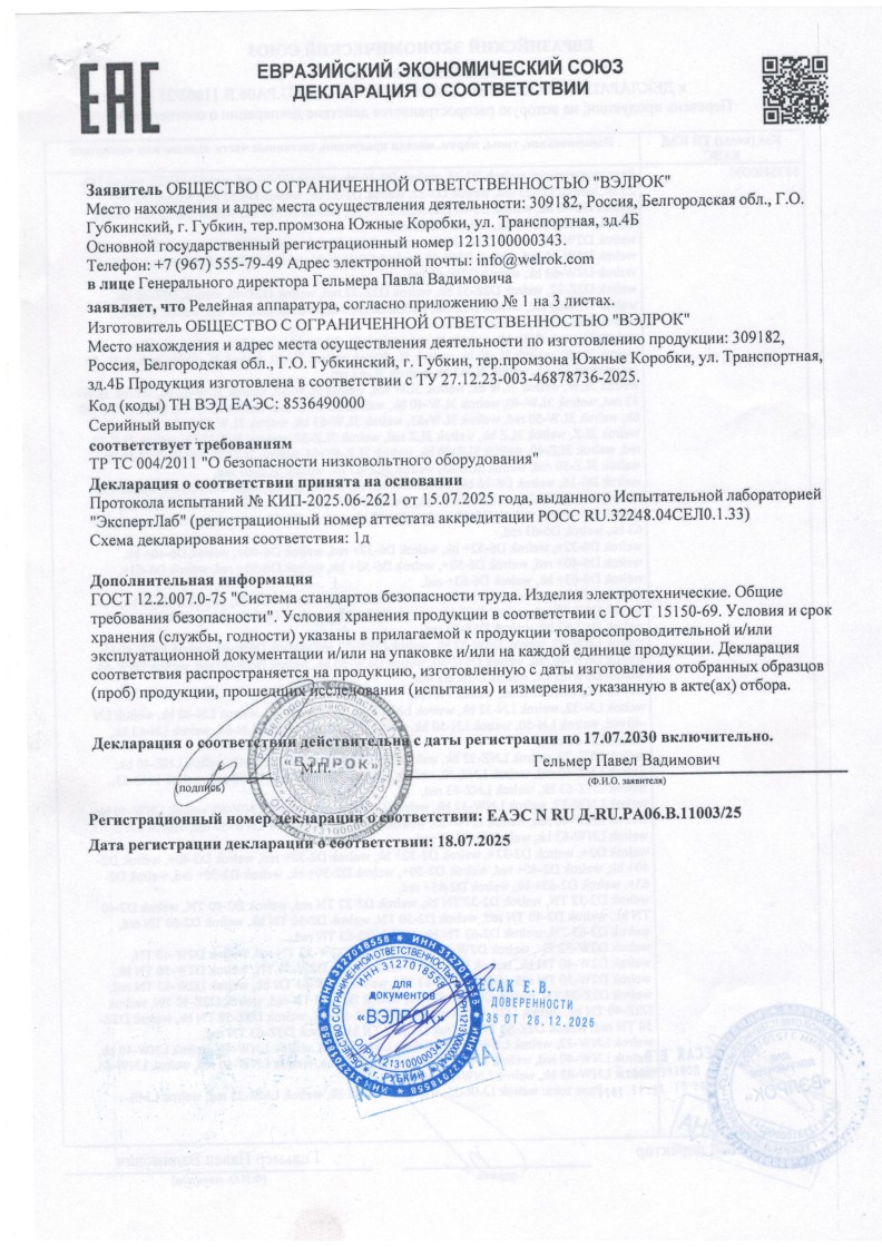 ЕЭС ДС №ЕАЭС RU Д-RU.РА06.В.11003/25 ВЭЛРОК до 17.07.2030
