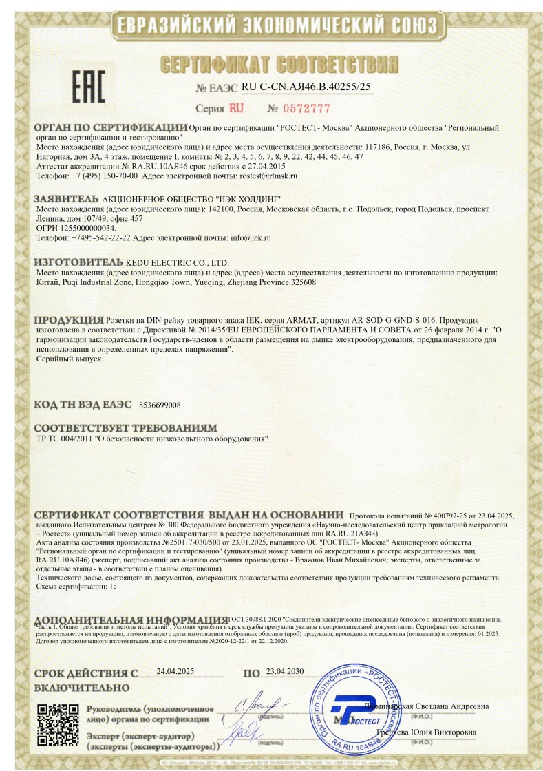 № ЕАЭС RU C-CN.АЯ46.В.40255/25 (ТР ТС 004/2011) до 23.04.2030