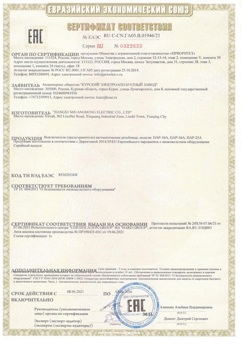 Предохранитель авт. резьбовой ПАР-16 (пробка автоматическая) УХЛ4 КЭАЗ 100043.