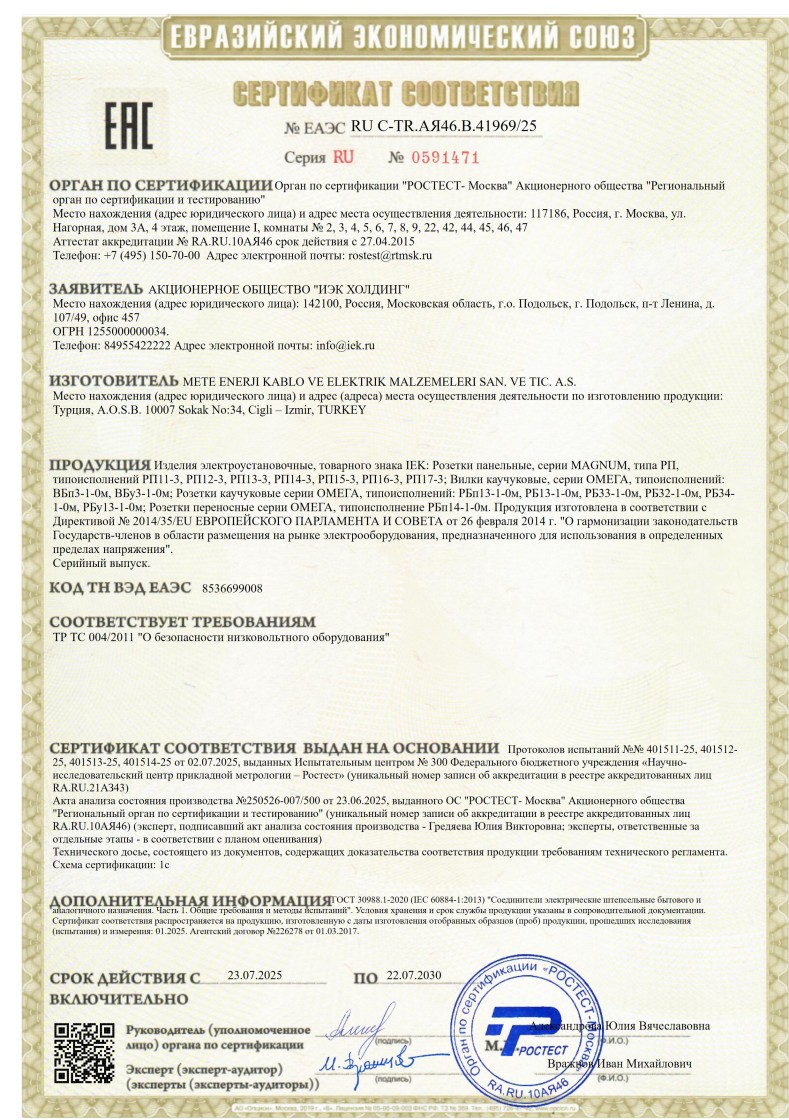 № ЕАЭС RU C-ТР.АЯ46.В.41969/25 (ТР ТС 004/2011) до 30.10.2030
