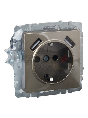 BRITE Розетка 1-местная с заземлением с защитными шторками 16А с USB A+A 5В 3,1А РЮш10-2-БрШ шампань IEK