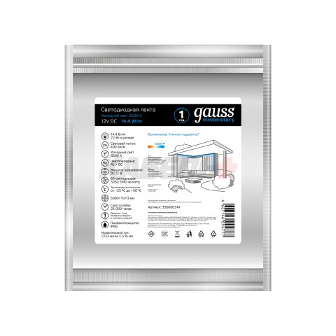 Лента Gauss LED Elementary 5050/60 12V 14.4W 6500K 10mm IP66 5m (ZIP bag) 1/100